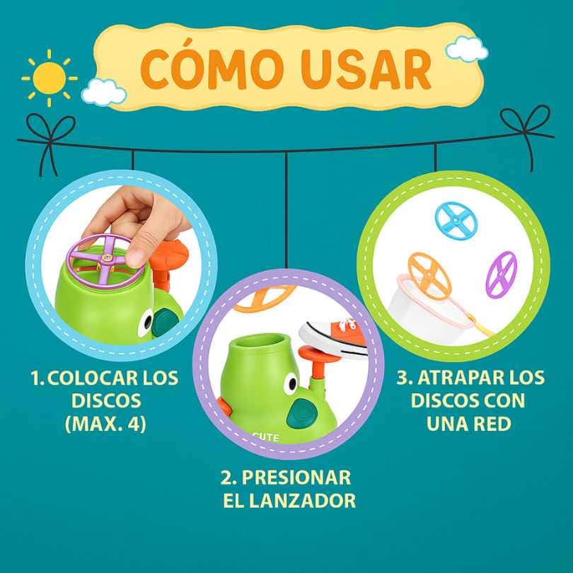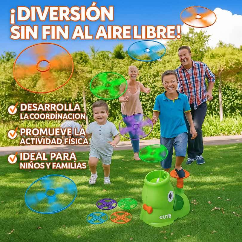 Su diseño interactivo y colorido invita a los niños a moverse, correr y competir mientras lanzan y atrapan discos voladores, creando momentos de diversión activa en cualquier lugar.